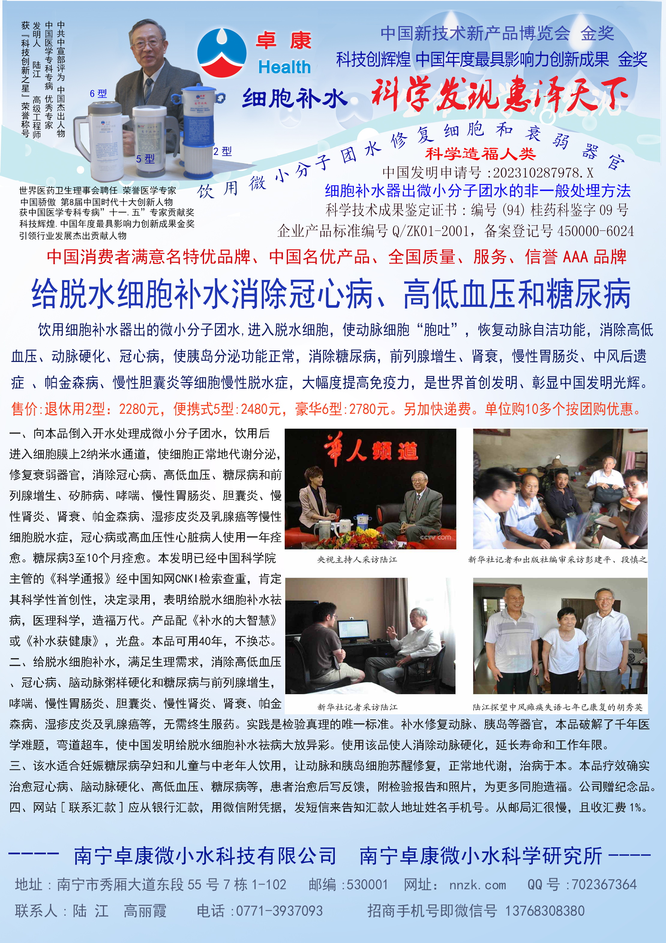 人類幾千年來患以上病癥需終生服藥,幾十年也不能治愈。可是我國南寧的高級工程師陸 江,于1990年想根治高血壓,研究發(fā)明了離子水瓶,處理出微小分子團水供飲用,經過醫(yī)院臨床試用和專家鑒定,1999年獲中國發(fā)明專利權,產品于2000年投放市場后一直跟蹤調查,據全國各地用戶反饋:祛除了高低血壓、糖尿病和冠心病,并使前列腺增生、咽喉炎、鼻竇炎、慢性氣管炎、支氣管炎、矽肺病、哮喘、慢性胃炎、腸炎、慢性膽囊炎、慢性腎炎、腎衰、膀胱炎、便秘、痔瘡、風濕性關節(jié)炎和濕疹皮炎及中風后遺癥等病癥不藥而愈。為什么喝微小水能治20多種病?陸 江從1991年德國科學家發(fā)現細胞膜水通道僅為2納米獲得啟發(fā),認為多種器官患病是因細胞脫水,不能正常代謝和分裂增殖,才使器官細胞減少致衰弱萎縮而形成細胞缺水性病癥。22年來的實踐有力地支持了“細胞脫水致病”這一重要論點,表明喝微小水可滿足細胞的生理需求,補水就能祛病,是生命科學新亮點。