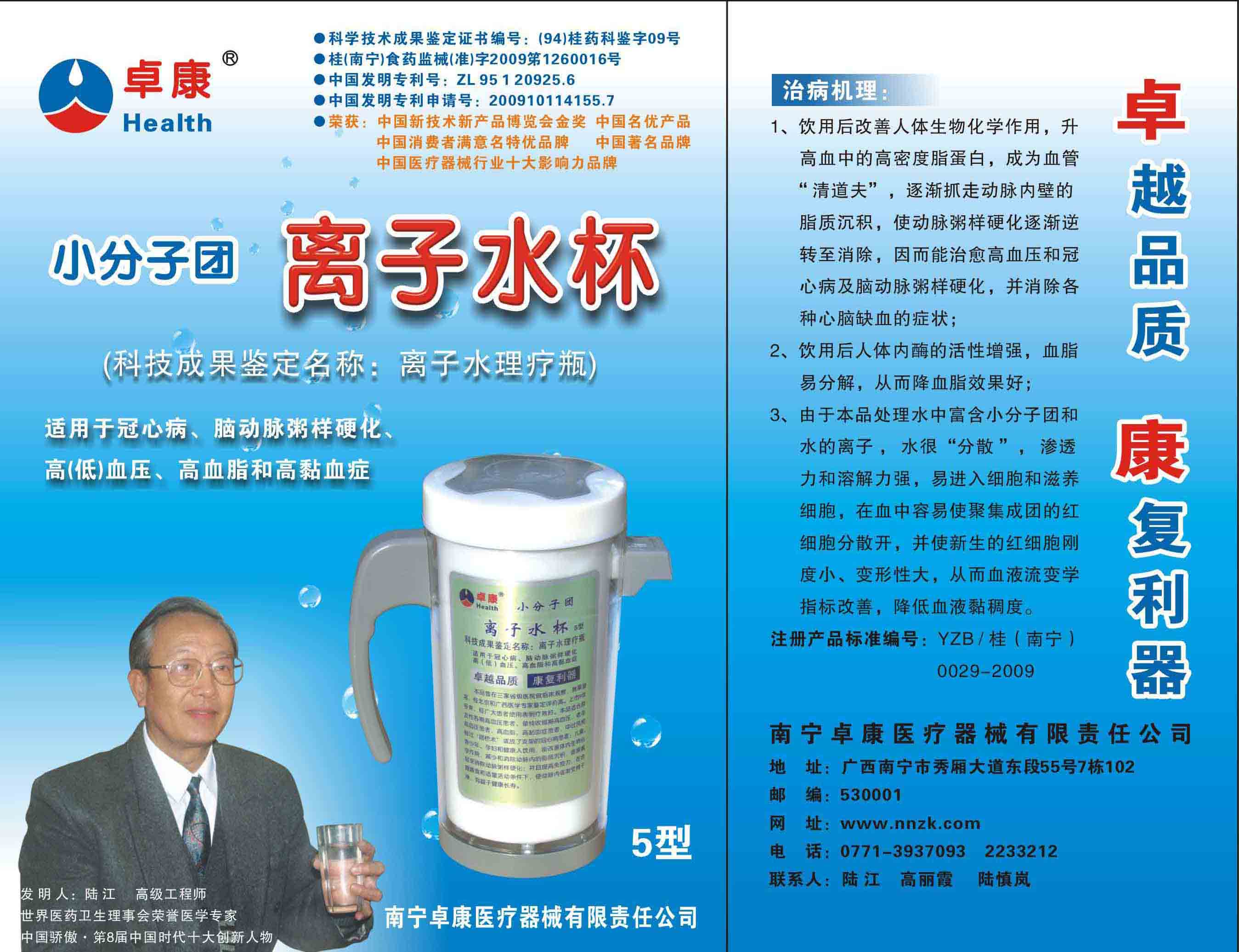 本品大量用戶的使用效果表明,能治愈冠心病、腦動脈硬化、原發(fā)性高(低)血壓、高血脂、高粘血癥、高血尿酸癥(痛風)和2型糖尿病、衰弱器官并發(fā)癥(前列腺增生、腎衰與尿毒癥)及中風后遺癥等療效好。產品配信譽卡。使用壽命30年,不換芯,易清洗。團購優(yōu)惠。從郵局匯款,匯費1%,地址按本頁下方地址、聯系人寫。從銀行匯款,請點擊[聯系匯款]欄,從工商銀行匯款,建設銀行、農業(yè)銀行匯款,均免收匯費,匯款后20--30分鐘內發(fā)短信,可用微信轉帳,均免匯費,微信號即手機號13768308380。匯款后,告知你的姓名和地址,我公司聯系人手機號是:13768308380卓康牌離子水瓶為我公司獨家生產,郵購產品配《補水的大智慧》彩印書一本,另配四季出版社出版的新書《補水的大智慧》一本,并配光盤一張(含央視主持人釆訪陸江的對話視頻)。目前市場和"淘寶網"上有人兜售假冒的偽品,望讀者審察辯別真偽,造假者剽竊假冒本公司的各種證、獲獎獎項、專利號和外包裝盒上的中英文字,包括科技成果的鑒定意見等,請讀者注意防偽。如何識別假貨?已經買了假貨怎么辦?(請點擊[打假掠影][打假掠影])。